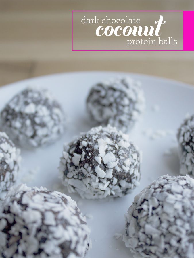 Make dark chocolate protein balls by mixing the below ingredients by hand or with a food processor. Then roll the mixture into 1.5 inch balls and roll each ball in shredded coconut to coat. Leave in the fridge for a few hours before eating.