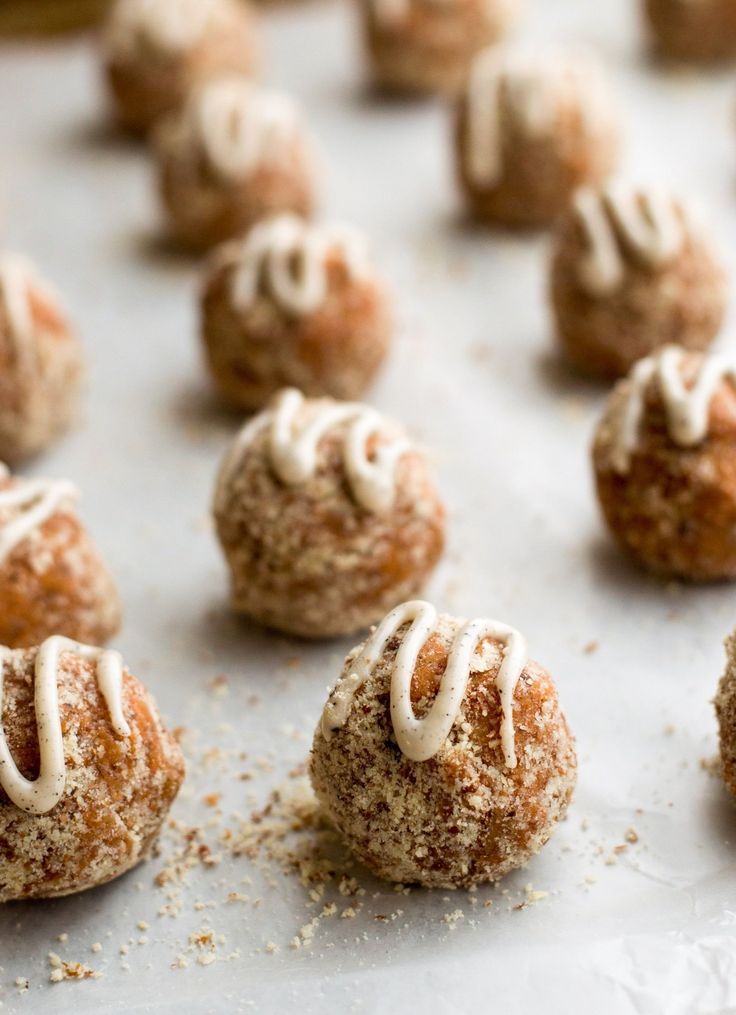 Now, you will need to roll the bites using your cooled mixture. Sprinkle a little more almond flour on the sides and top of the dough to coat completely, then roll into a ball. Finally, drizzle icing over the tops of the balls by snipping off a small corner of the sandwich bag.