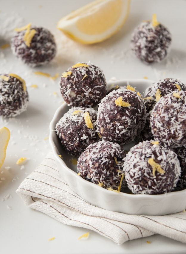 Blueberry lemon energy bites take just 10 minutes to prep. Use a food processor to blend the shredded coconut and cashews, then add the blueberries, dates, lemon zest, lemon juice, vanilla extra, and salt, and continue to process until the mixture holds together. Roll into small balls (about 1 or two inches) and add some more coconut and lemon zest to the top. Store these in an airtight container in the fridge to keep them fresh for up to a week.