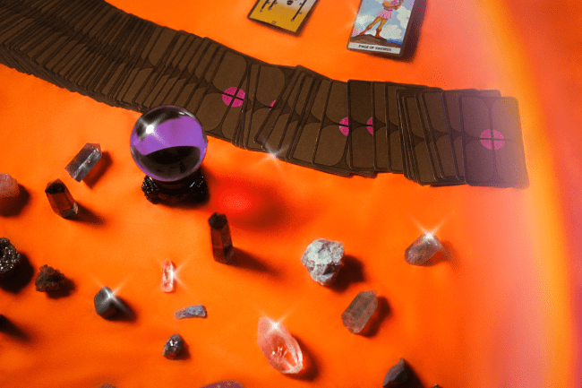 A witch woman holding palo santo, sitting on the floor, surrounded by Tarot cards, crystals, and lit candles, ready to tell you all about your future.