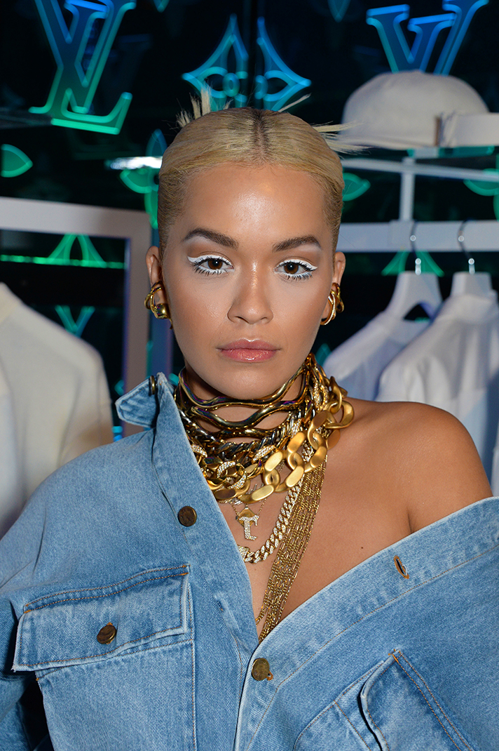 To further cement her status as a risk-taking style star, Ora lined her eyes with stark white liquid liner and pulled her hair back into a piece-y, frayed chignon.