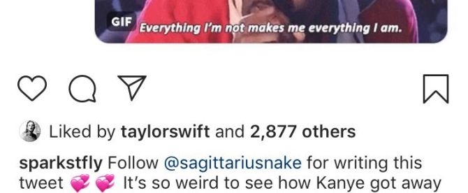 One of her fan accounts called Kayne out writing, “The famous music video was straight up revenge porn. not to mention putting abuse victims next to their abusers and celebrating sexual assaulters. it was disgusting and he doesn’t get enough crap for it.” VERY opinionated and also not wrong. Swift definitely seems to agree. She appeared in the likes section of this post, double tapping and thereby agreeing with the sentiments of the Instagram caption.