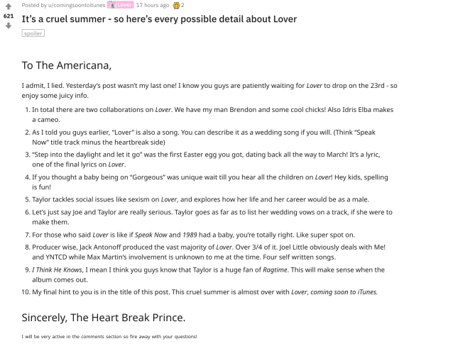 Now, someone has hopped on Reddit to confirm the list as well. They’ve said that the list is accurate except for Track 9. Apparently, the song is titled “Cornelia Street” and not “Cornelius Street“.  They also claim that order of the tracklist is also wrong since Taylor played the songs out of order at the listening session.