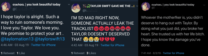 Obviously, Swifties are not having it! One fan tweeted, “REPORT THIS ACC. @TracklistLover ‘SECRET’ SESSIONS DONT DESERVE TO PEOPLE LIKE U FUXK U.” Another wrote, “Swifties @TracklistLover should be arrested. I have done my research and she is breaking British laws about copyright. Oh sis you got a big storm coming. We are gonna raise hell.”