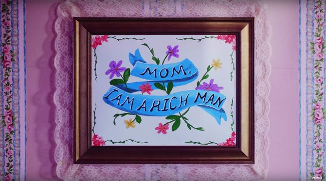 Toward the beginning of the video, there is a quick snap of a painting that reads, “Mom, I am a rich man.” This is an iconic quote from an interview Cher did back in 1996. She said, “I think men are the coolest, but you don’t really need them to live. My mom said to me, ‘You know, sweetheart, one day you should settle down and marry a rich man. I said, ‘Mom, I am a rich man.'” YASSSS.