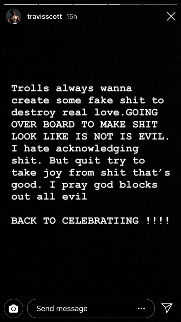 But how much of the picture can we believe? Well, according to Scott, none of it. After a fan asked him about the photo on Instagram, Scott commented back, denying that he cheated on Jenner and claiming that the picture was photoshopped. “Trolls working hard today,” he wrote. “I don’t be on a balcony wit no thots. That shit lame. Try again u trollsssss. Me and my wifey sturdy. Back to celebrateing !!!” He added, “Only got love for my wife. No time to be wasting. Try again.”